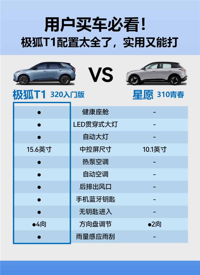 续航与补能的扎实表现,让极狐 T1 的驾控无后顾之忧。425km 的续航里程比星愿 310 梦想版多出 115km,表显 0 公里后仍能行驶 10-20 公里,应急时更安心。30%-80% 充电仅需 16.9 分钟,一杯咖啡的时间即可快速补能,比星愿的充电速度更快。全系标配的热泵空调,最大可节能 15%,提升续航 30-35km,-30℃极寒环境仍能工作,冬季用车不焦虑,星愿在低温续航和制热效率上稍显不足。